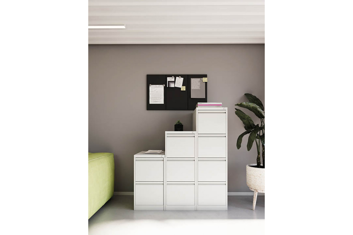 Шкаф оснащён тремя выдвижными ящиками, установленными на шариковых направляющих полного выдвижения, что обеспечивает плавное, бесшумное и полное открывание каждого ящика. Такая конструкция позволяет использовать всё внутреннее пространство и быстро находить нужные документы. Каждый ящик выдерживает нагрузку до 30 кг, подходит для папок формата A4 и Foolscap, а встроенная планка-держатель помогает организовать внутреннее пространство максимально упорядоченно.