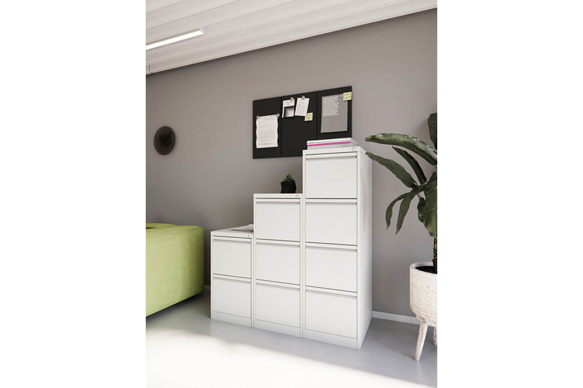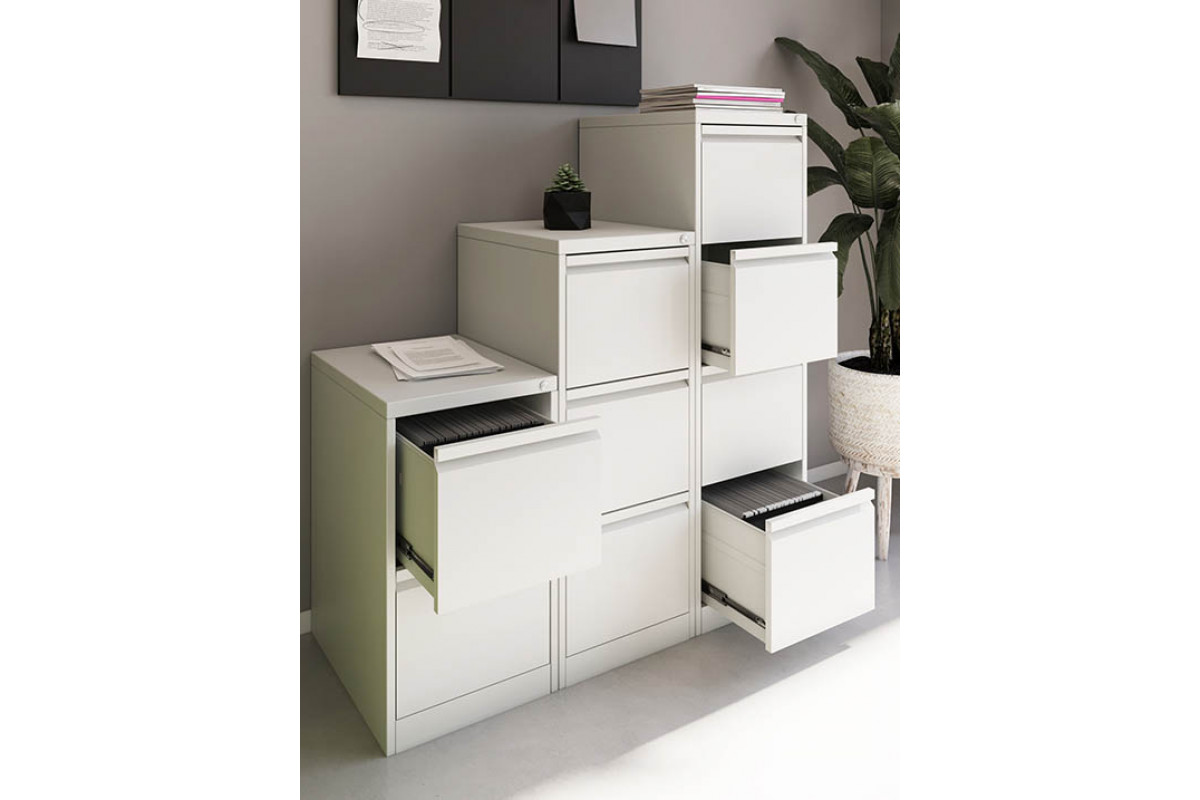 Шкаф оснащён четырьмя выдвижными ящиками, установленными на шариковых направляющих полного выдвижения. Это позволяет полностью использовать глубину ящиков, легко просматривать содержимое и обеспечивать быстрый доступ к документам. Каждый ящик выдерживает нагрузку до 30 кг, а благодаря встроенной планке-держателю папок формата A4 документы всегда остаются аккуратно организованными. Сборная конструкция ящика выполнена из стальных деталей толщиной 0,4–0,5 мм и имеет безопасные загибы по кромкам.