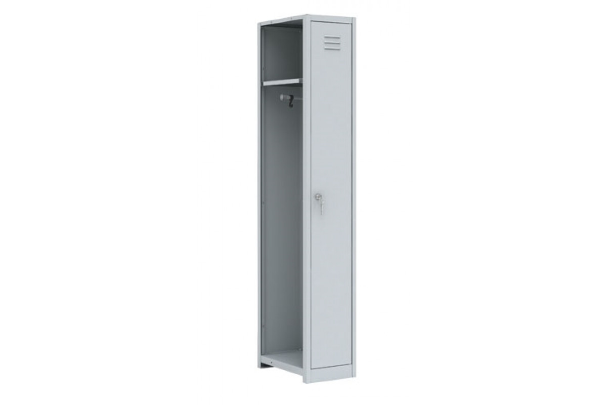 Дополнительная секция модульного ряда. В отделении: полка для головного убора, перекладина для вешалки и крючки для одежды, врезной замок. Шкаф может комплектоваться полками для обуви (в комплект не входят). Полимерное порошковое покрытие светло-серого