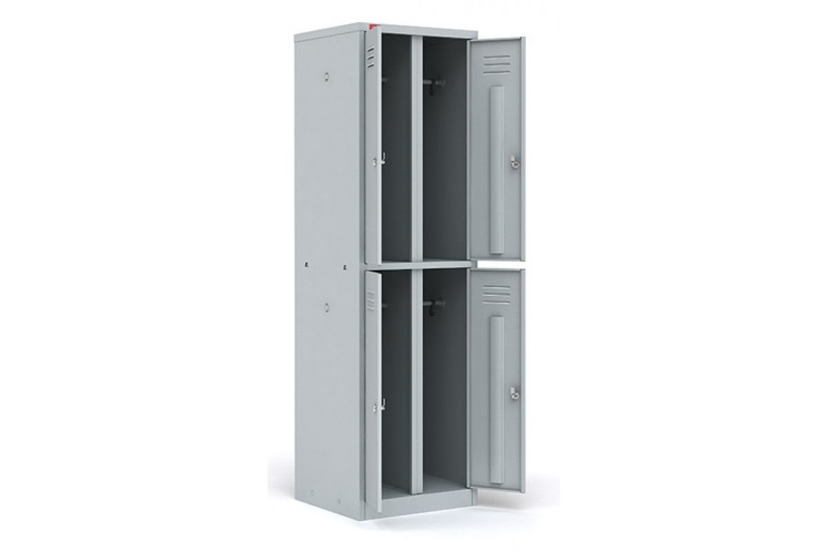 Шкаф разборный металлический двухсекционный с 4-мя отделениями, в стандартную комплектацию каждого отделения входят перекладина для вешалки крючки для одежды, врезной замок. Полимерное порошковое покрытие светло-серого цвета (RAL 7035).