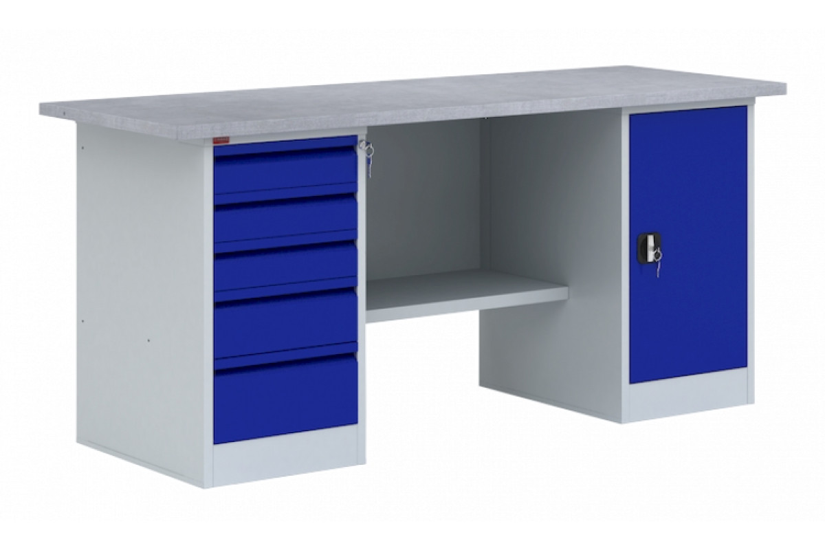Верстак ВП-4т состоит из отдельных модулей: столешница из МДФ, покрытая оцинкованным листовым металлом, стенка задняя – металлическая, тумба с двумя съемными полками (нагрузка до 30 кг) и дверью запирающейся замком, тумба с 5-ю выдвижными ящиками на те