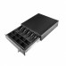 GlobalPOS 410 изготовлен из стали, окрашенной в черный цвет. Лоток из ABS-пластика имеет 4 отделения для банкнот с прижимным механизмом и 8 отделений для монет. Лицевая панель имеет 2 щели для закладки документов. Замок, открывающий ящик имеет 3 положения.Особенности:
