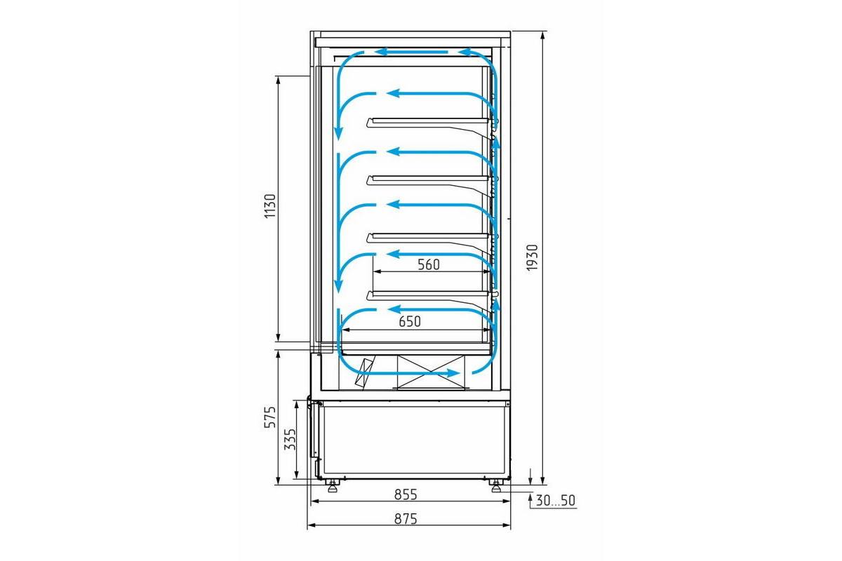 Витрина имеет прямоугольную форму, ее корпус изготовлен из окрашенной стали и установлен на регулируемые по высоте ножки. Холодильный агрегат встроен в нижнюю часть корпуса, на перфорированном фасаде агрегатного отсека установлен электронный блок управления с контроллером. Боковые термоизолированные стенки витрины оборудованы энергосберегающими стеклопакетами. Задняя панель рассчитана на навешивание 4 полок на необходимом уровне. Витрина закрывается распашными дверцами из закаленного низкоэмиссионного стекла с ручками в виде круглых отверстий с защитными кольцами.