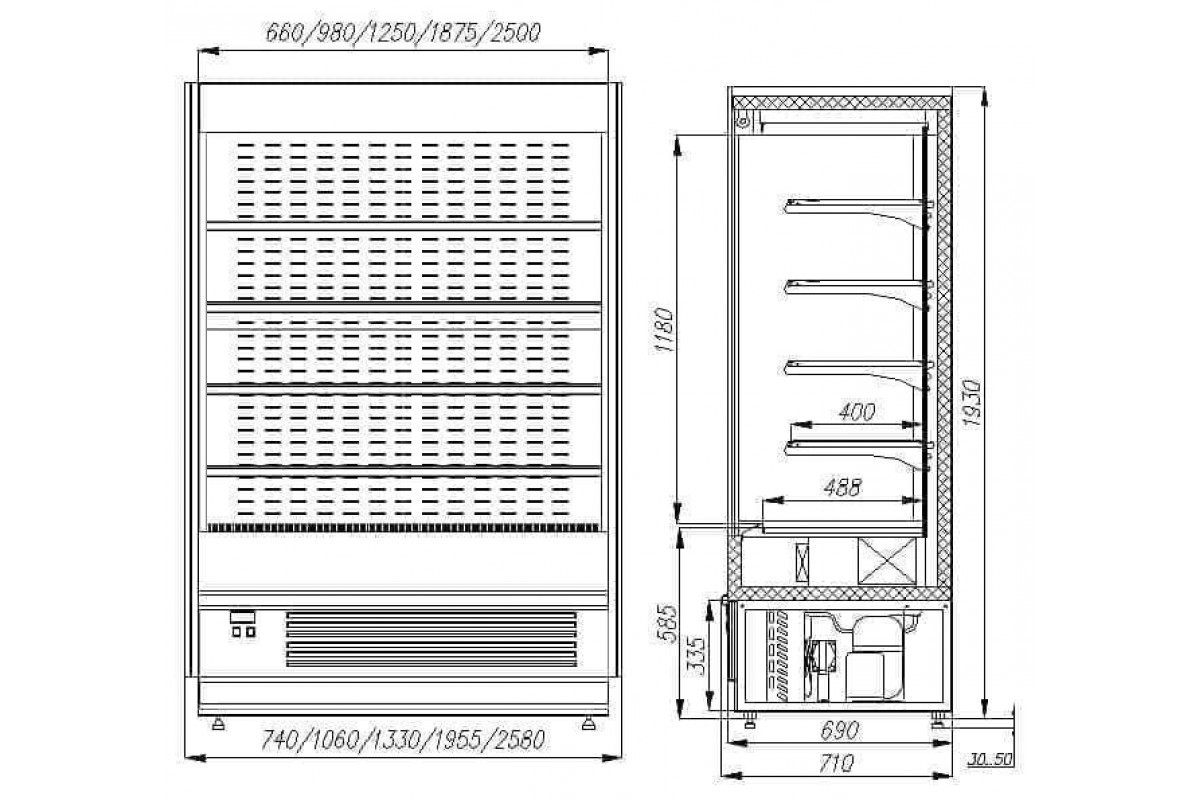 Холодильная горка гастрономическая Carboma FC20-07 VM 0,7-1 Light (фронт X0, цвет по схеме, фронт стандартный цвет)