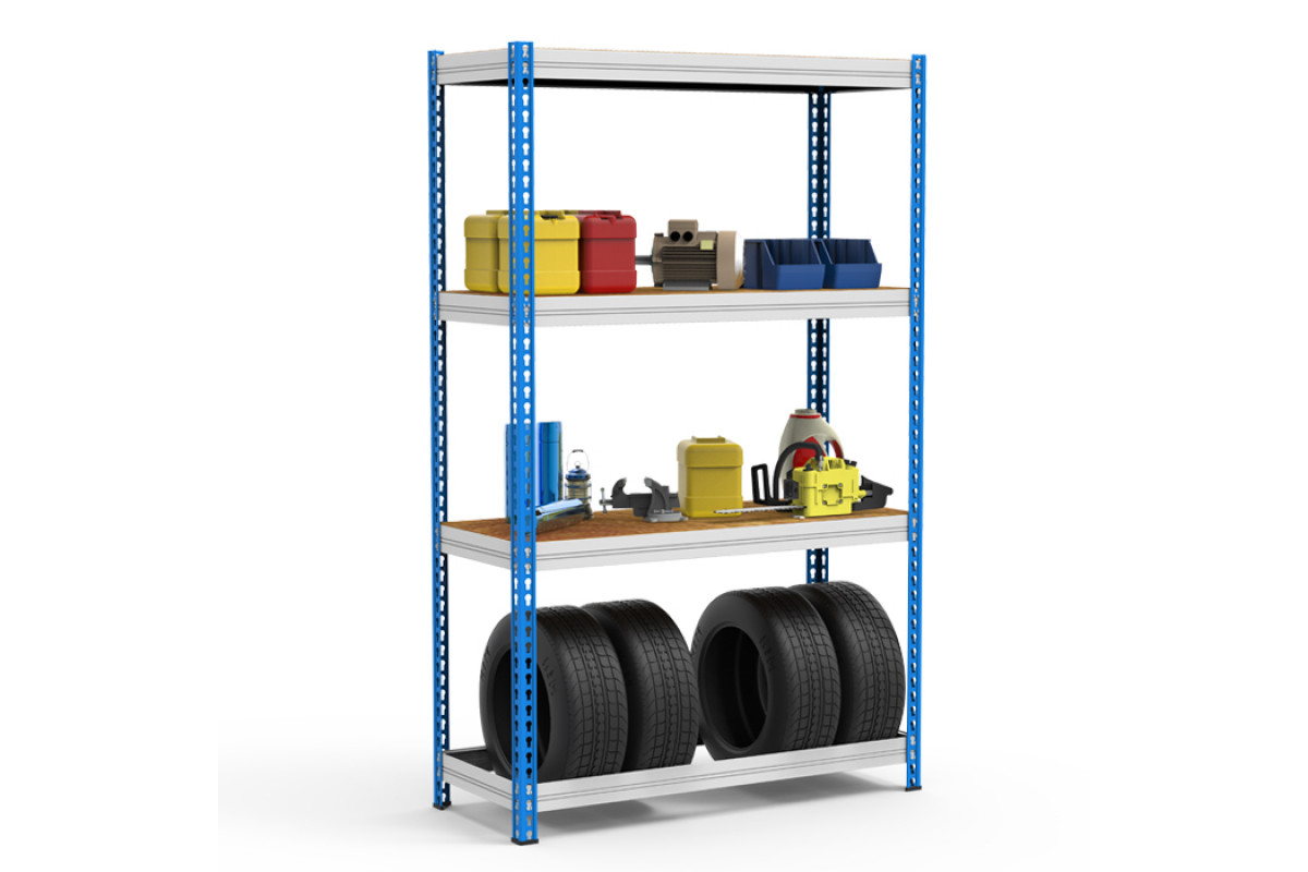 - Стеллажи полочные, сборно-разборные. Особенности конструктивного исполнения стеллажа позволяют производить сборку без дополнительных крепежных элементов. Профиль балки МКФ позволяет использовать стеллаж в двух вариантах: одна сторона предназначена для настила, другая – для хранения автомобильных колес. В первом варианте каждая полка (ярус) состоит из продольных и поперечных) балок, на которых размещается усиленная фанера, во втором варианте – только продольные и поперечные балки. Балки стеллажа крепятся к стойкам при помощи двух замков с зацепами. Стеллажи с представленными размерами позволяют хранить колеса радиусом от 13” и выше.
