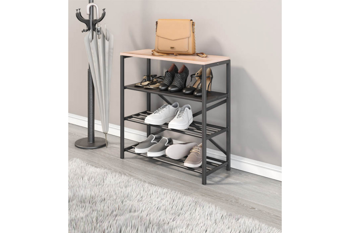 Обувница GUTTA 71х69х29 см, четыре полки — это стильное и функциональное решение для хранения обуви в стиле лофт. Каркас выполнен из качественной конструкционной холоднокатаной стали марки 08пс, что обеспечивает высокую прочность и долговечность изделия. Металлические детали покрыты порошковой краской черного цвета, которая защищает их от коррозии и придает обувнице элегантный внешний вид.