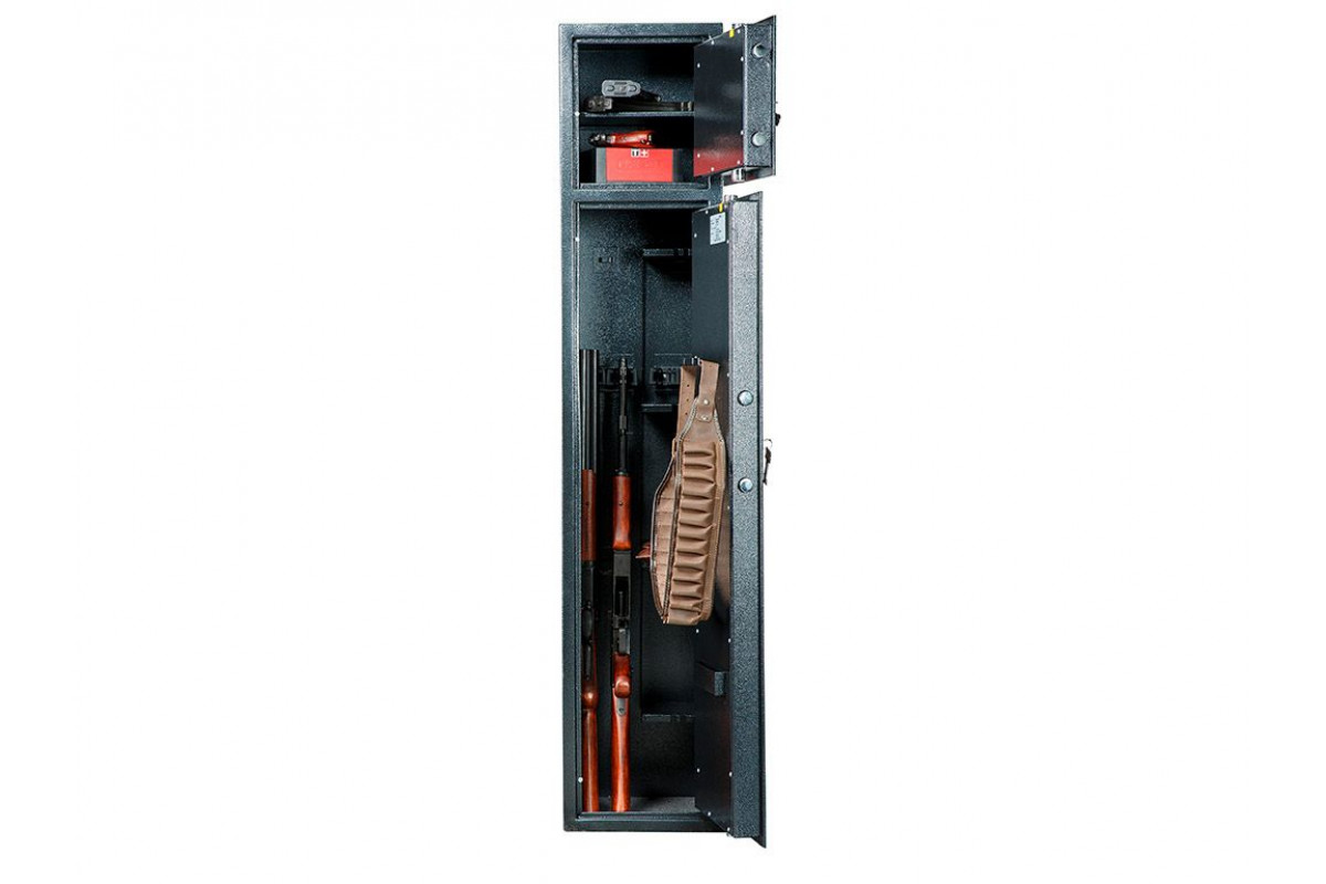 Предназначен для хранения огнестрельного оружия и патронов к нему. Сейфы соответствуют требованиям ст.59 Постановления правительства РФ № 814 от 21 июля 1998 года «О мерах по регулированию гражданского и служебного оружия и патронов к нему на территории РФ». Соответствуют Классу А.1 оружейных сейфов в соответствии с требованиями ГОСТ Р 56367-2015. толщина металла корпуса – 3 мм; толщина металла двери – 5 мм 3-х сторонняя ригельная система запирания (диаметр ригеля 18 мм) оборудованы патронным отделением (трейзер), запирающимся на ключ (соответствующий 3 классу по ГОСТ Р 5089-2003 или замок не ниже класса А по ГОСТ 51053-2012), полками и ложементами для ружей, ковриком комплектуются двумя ключевыми замками Kaba Mauer (класс А по ГОСТ Р 51053-2012) наличие анкерных отверстий для крепления сейфа к полу и стене максимальная высота ружья 1163 мм
