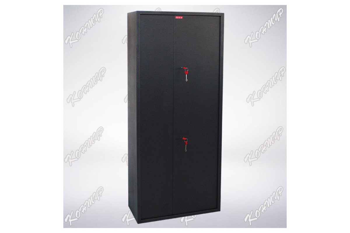 Шкаф предназначен для хранения и ограничения несанкционированного доступа к гражданскому и служебному оружию, боеприпасам и принадлежностям. Шкафы представляют собой цельносварную металлическую конструкцию, соединение элементов которой выполнены методом сварки сплошным швом по контуру прилегания элементов. Корпус шкафа изготовлен из стального листа толщиной 1,5 мм, полотно дверей(в количестве 2шт.) — из листа толщиной 2 мм.Полотно дверей изнутри усилено панелью коробчатого сечения из стального листа толщиной 0,8 мм, на которой располагаются дополнительные элементы, такие как: шомполодержатель, скоба, масленка. В верхней левой части шкафа «ОК-10т» располагается отсек ограниченного доступа (трейзер), запираемый на замок «почтового» типа, а в нижней 3 съемные полки, регулируемые по высоте. Правое отделение оборудовано 5-ю ложементами зажимного типа, предназначенные для упорядоченной укладки оружия и позволяющие сберечь оружие от царапин и потертостей. На дне отсека резиновый коврик красного цвета.На задней стенке шкафа предусмотрены 2 отверстия ? 7 мм для возможности крепления его к стене. В шкафу установлено два 8-ми сувальдных замка фирмы «ПРО САМ» (Россия) с классом устойчивости 2 по ГОСТ 5089-2003. Петли – внутренние. Покрытие шкафа – порошковое полимерное, цвет в стандартном исполнении — «черный муар».Шкаф не подлежит обязательному декларированию или сертификации. Дополнительное оборудование на двери: шомполодержатель, скоба, масленка. Возможность крепления шкафа к стене: 2 отв. 7 мм на задней стенке шкафа. Покрытие шкафа, цвет: Полимерное порошковое, «черный муар». Толщина металла корпуса, мм: 1,5. Толщина металла двери, мм: 2