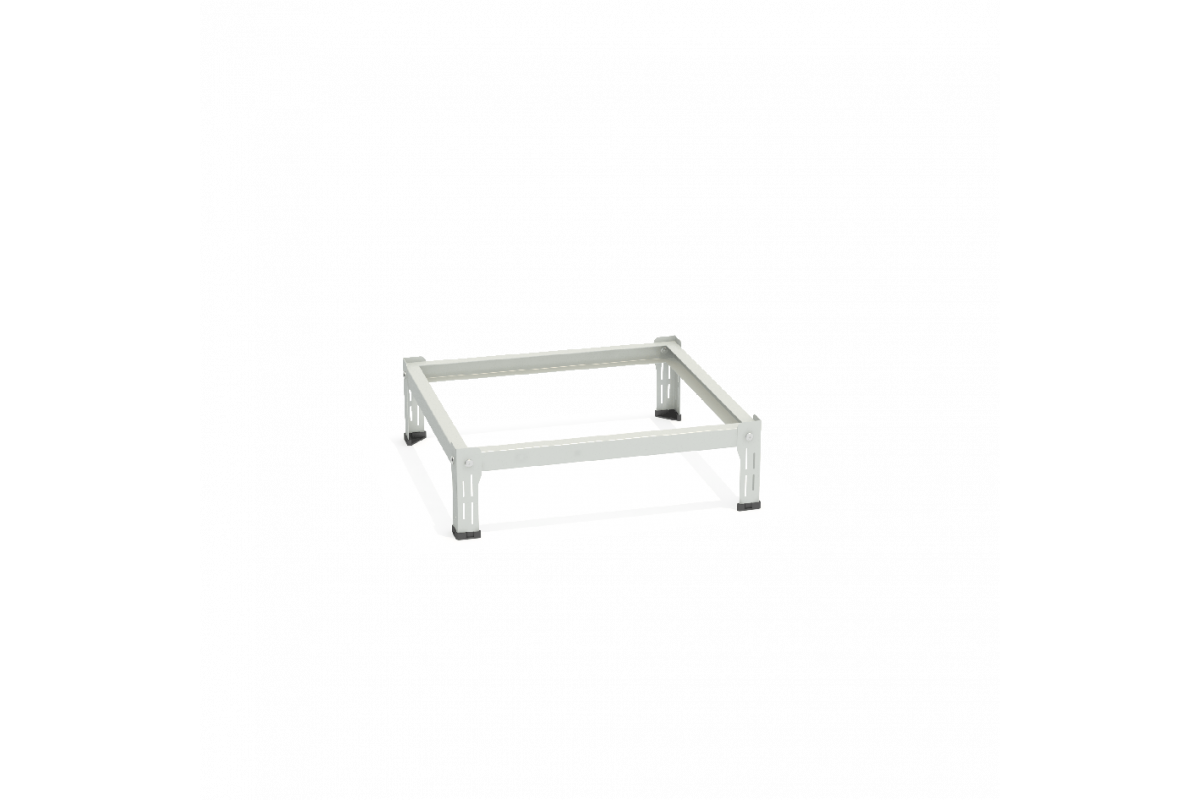 Металлическая подставка серии РСМ представляет собой сборно-разборную жесткую конструкцию, состоящую из четырех горизонтальных балок (две продольные и две поперечные) и четырех опор (ножек). Сборка подставки осуществляется при помощи винтов М4х10 и фланцевых гаек М4. На ножках подставки для сборки предусмотрены по четыре квадратных отверстия размером 5х5 мм, на продольных балках предусмотрены восемь овальных отверстий, на поперечных балках по четыре овальных отверстия размером 5.5х6.5 мм. Детали подставки выполнены из качественной холоднокатаной конструкционной стали марки 08 пс, на ножках толщина стали составляет 1 мм, на балках толщина стали составляет 0.8 мм. Каждая из четырех балок имеет гнутый П-образный профиль. На двух продольных балках предусмотрены боковые отгибы, которые вкладываются внутрь поперечных балок и формируют замкнутый контур по периметру подставки. В комплектацию подставки входят четыре уголка специальной формы, каждый уголок устанавливается во внутренний угол основания подставки (сформированный балками) и усиливает конструкцию. Ножки подставки выступают вверх над балками и формируют четыре угловых ограничителя для надежной фиксации корпуса шкафа. Высота зазора между полом и основанием шкафа, установленным на подставку, составляет 150 мм. На каждой ножке подставки предусмотрена декоративная перфорация в виде четырех вертикальных пазов шириной по 3 мм. Для сохранности напольного покрытия, подставка оснащена четырьмя пластиковыми подпятниками, которые устанавливаются в «натяг» на ножки и не требуют дополнительного крепления. Цвет пластиковых подпятников - черный.