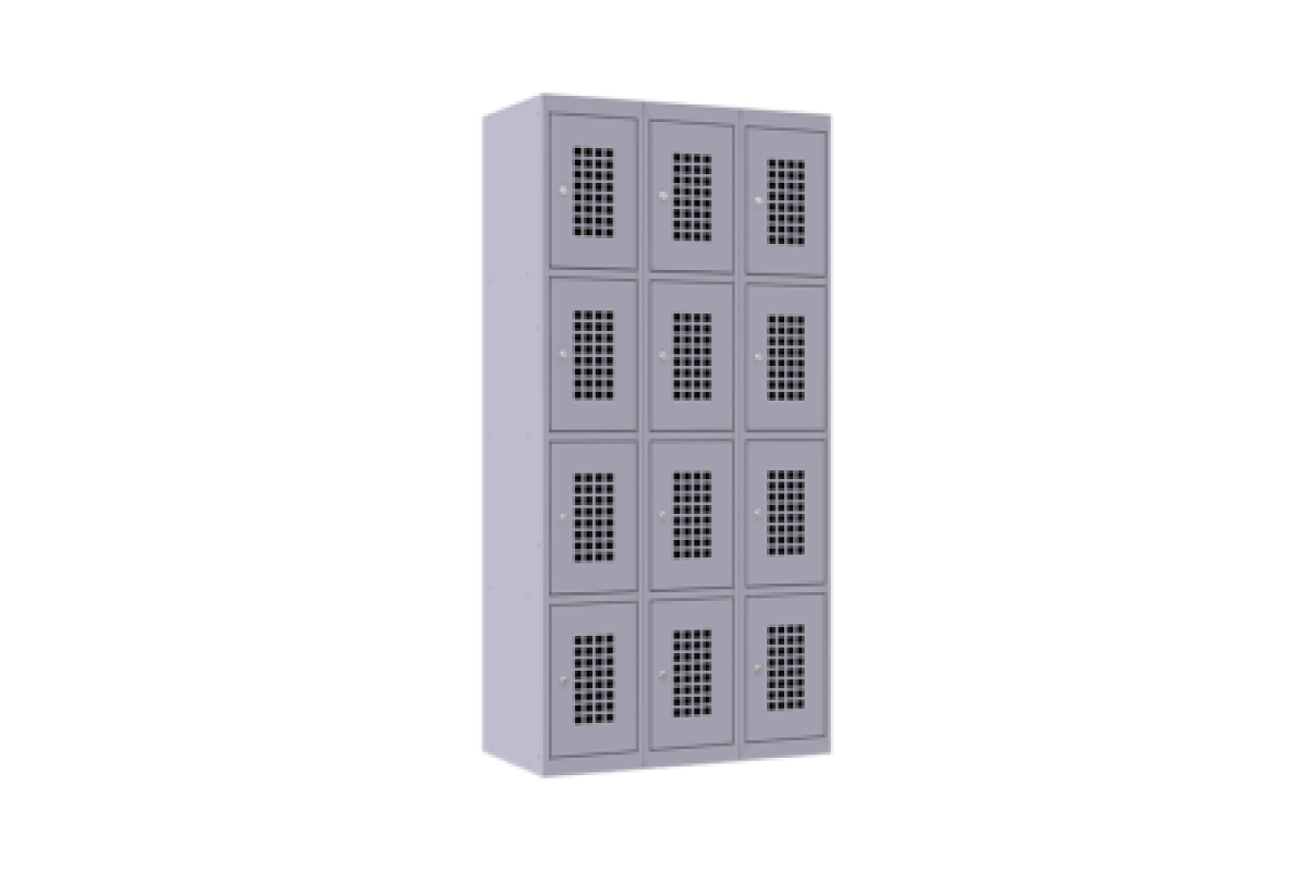 Шкаф состоит из 12 ячеек, каждая из которых имеет размеры 440х300х500 мм и оснащается замком повышенной секретности 1:2000. Перфорация на дверях — это 32 квадратных отверстия, имеющих размеры 22х22 мм, шаг отверстий 31 мм.