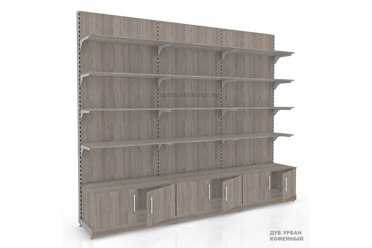 Стеллаж пристенный, с полками ДСП глубиной 300 мм и накопителем с распашными дверками V 1-03