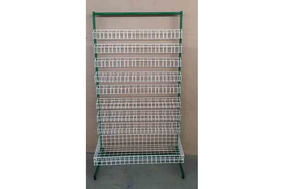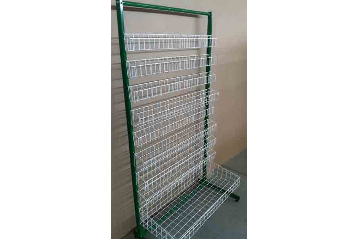 Стойки изготовлены из прочной металлической проволоки, общая конструкция стеллажа позволяет представить товар в самом выгодном свете.