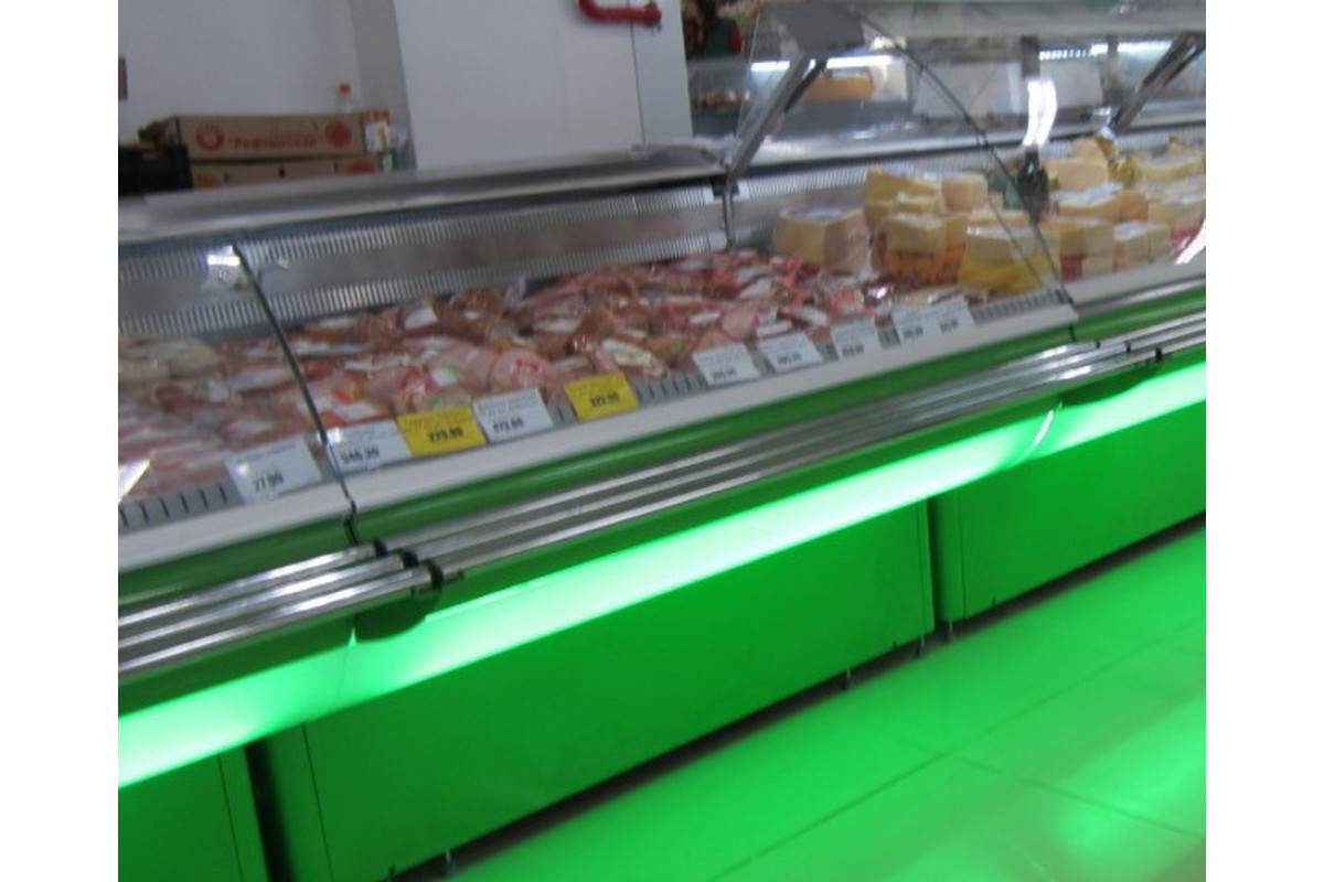 Благодаря легкой стыковки в линию, витрины Айс позволяют оборудовать объекты любой сложности: от магазинов до гипермаркетов и торговых центров - как при оснащении торговли через прилавок, так и при самообслуживании. Все витрины модельного ряда Айс имеют подсветку нижней декоративной панели красную, желтую, зеленую, синюю или белую.