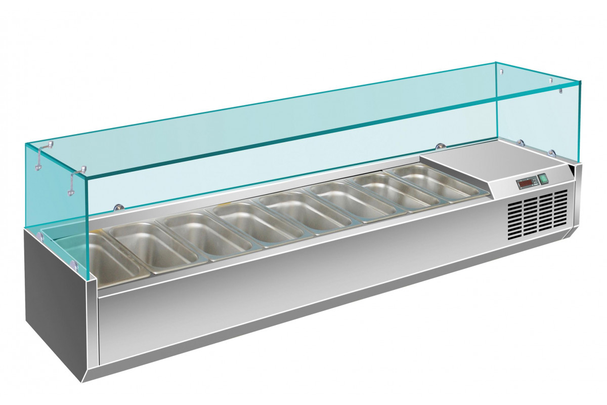 Витрина холодильная настольная VRX 1800/330 используется на предприятиях общественного питания и торговли для демонстрации, охлаждения и кратковременного хранения салатов, ингредиентов для пиццы и т.д.