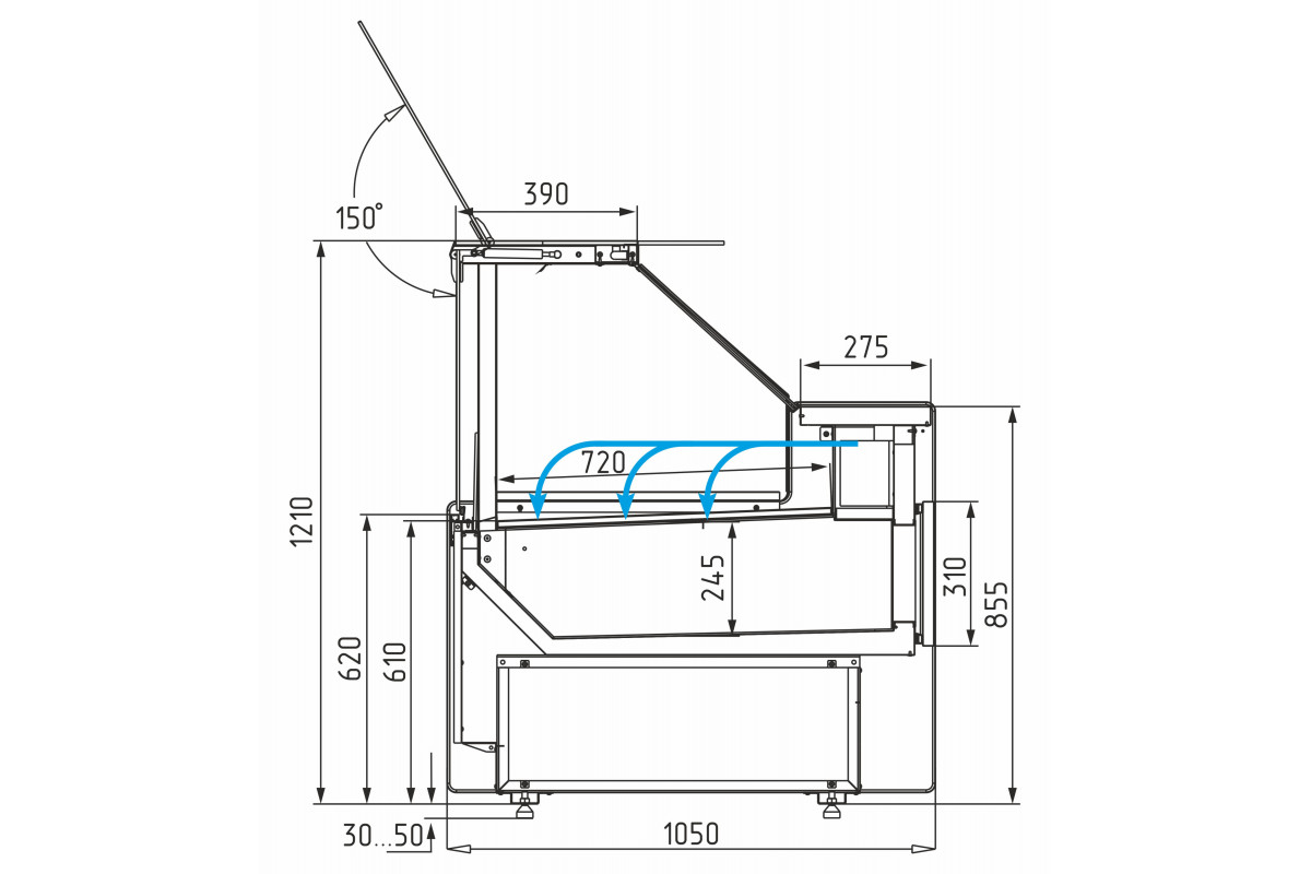Отдельностоящая витрина приобретается только вместе с боковинами. При заказе нескольких витрин с одинаковым температурным режимом для установки в линию достаточно заказать 2 боковины на всю линию.