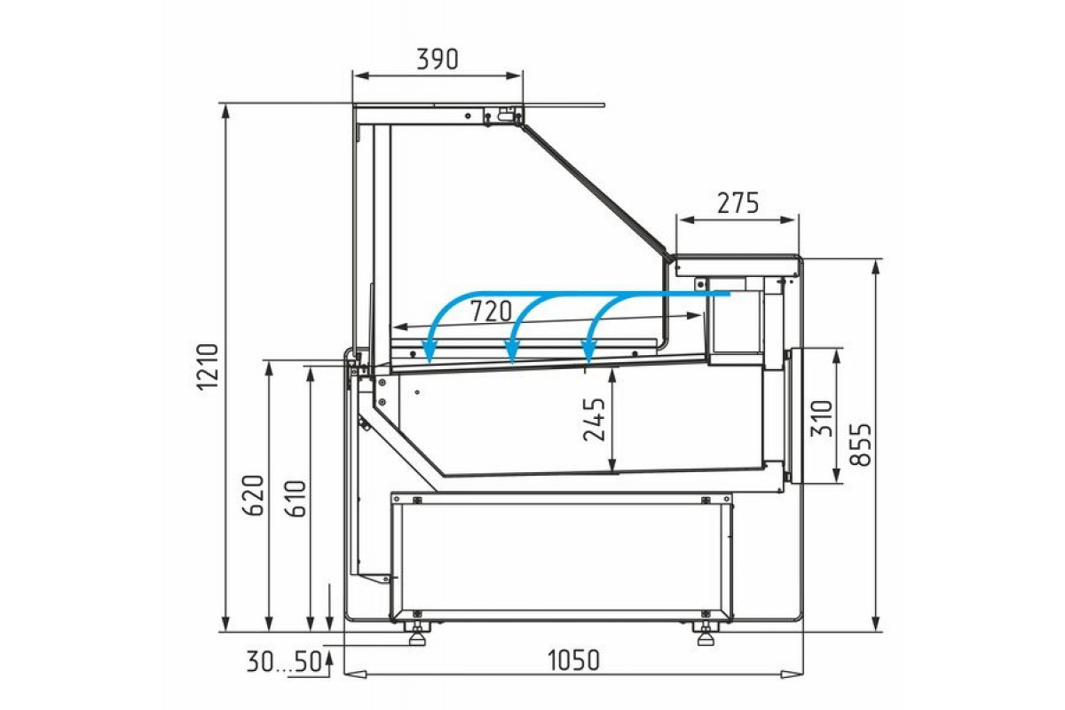 - Экспозиционная поверхность и столешница изготовлены из шлифованной нержавеющей стали, декоративные фронтальная панель – из МДФ;