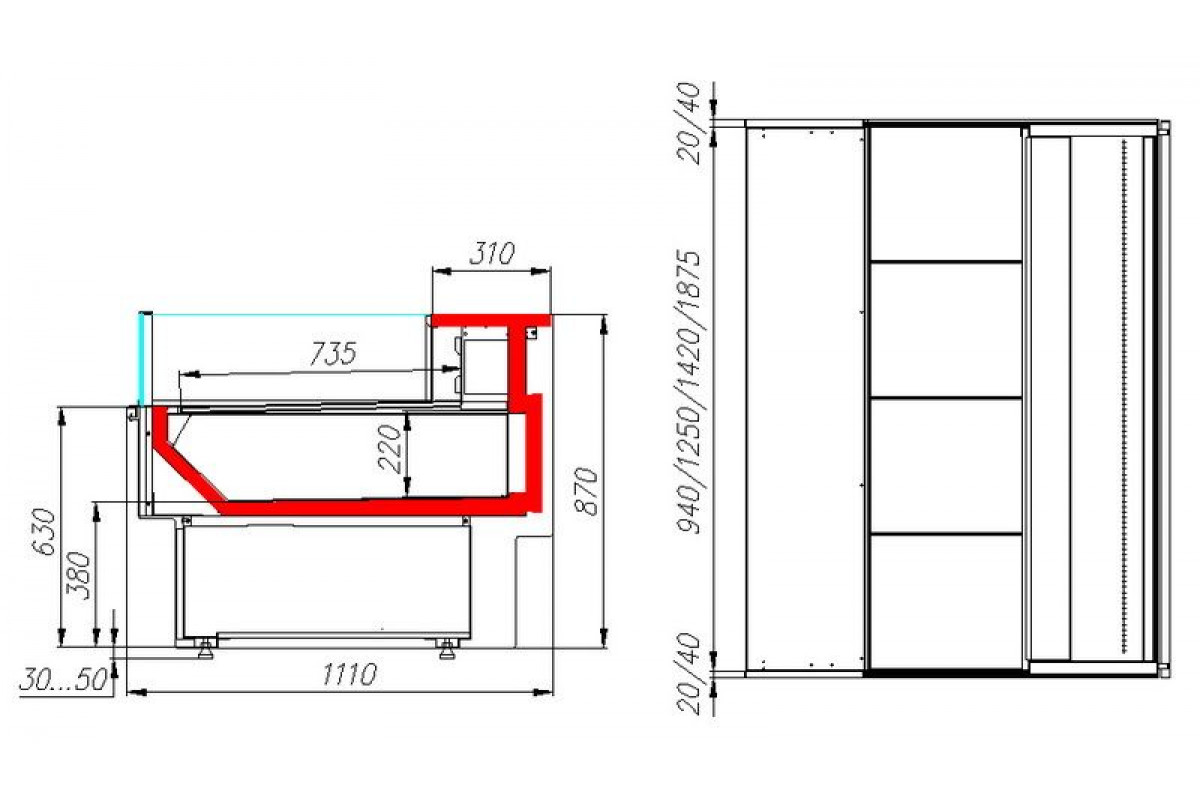 - 2х ступенчатые поддоны для выкладки. Общая высота поддона -120 мм, общая глубина-480 мм;