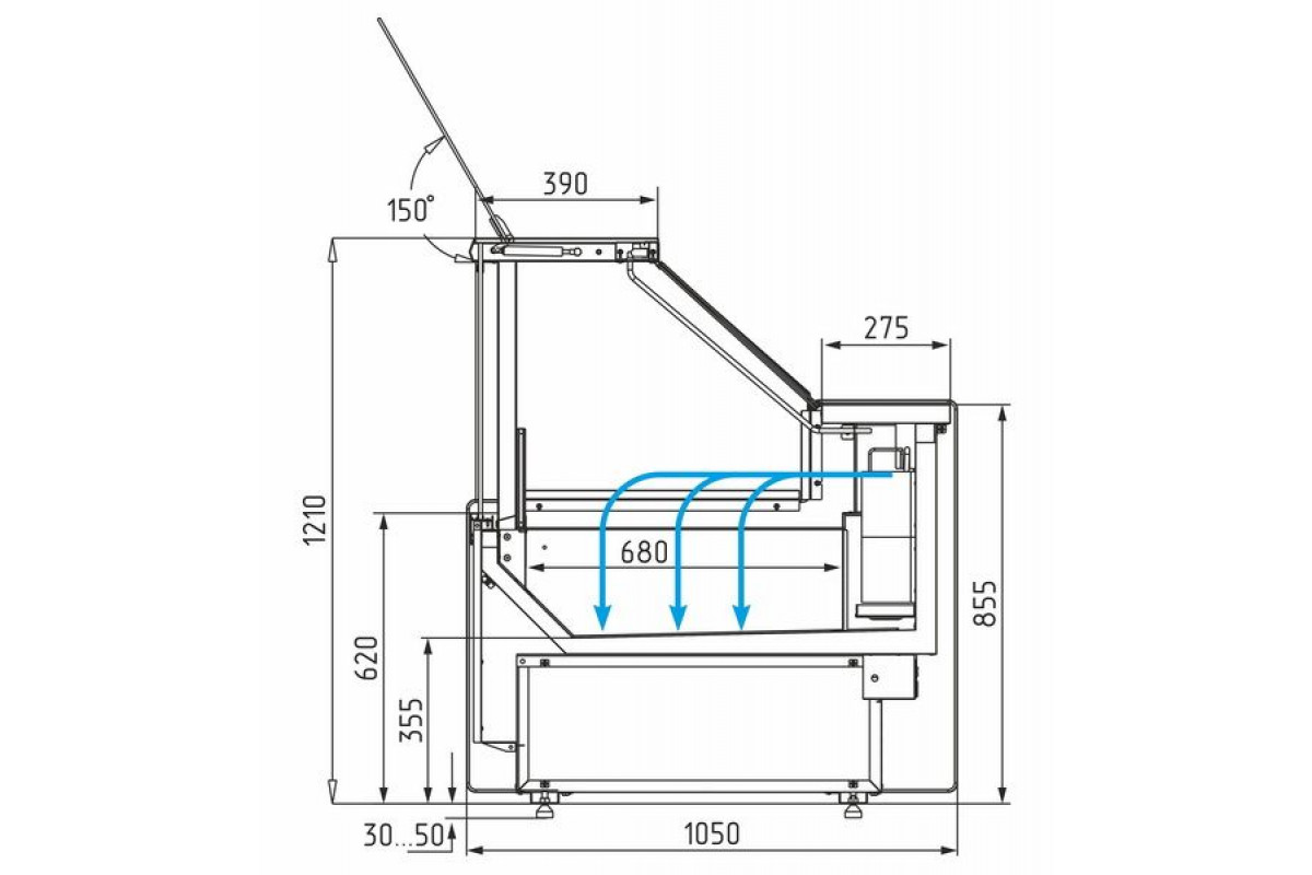 Отдельностоящая витрина приобретается только вместе с боковинами. При заказе нескольких витрин с одинаковым температурным режимом для установки в линию достаточно заказать 2 боковины на всю линию.