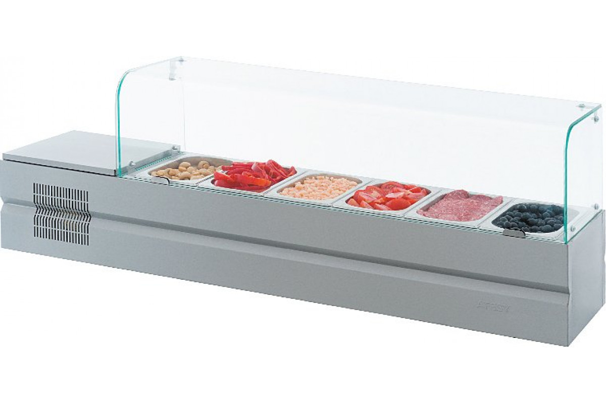 Холодильная витрина ATESY Болоньезе-6 используется на предприятиях общественного питания и торговли для кратковременного хранения и демонстрации компонентов пиццы (топпингов). Модель оснащена встроенным холодильным агрегатом, верхняя крышка которого вы