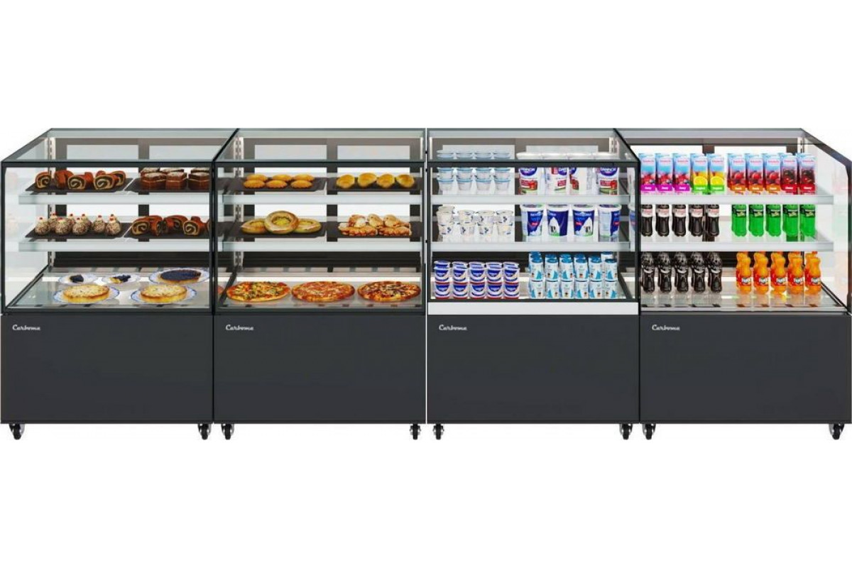 Витрина нейтральная напольная Carboma KC71-150 N 0,6-1 (9005) витрины COSMO идеально подходят для любой конфигурации помещений кондитерской, пекарни, кафе. Дают возможность легко менять и расширять концепцию, варьируя пространством и объёмом экспозиции продуктов. Ровные грани стеклопакетов и отсутствие соединительных планок во внешнем контуре остекления придают витринам легкость и эффект бесконечности.