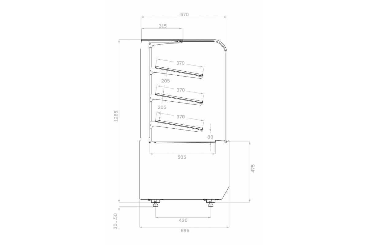 - Глубина выкладки базовой полки 505 мм + 3 полки с глубиной 370 мм.