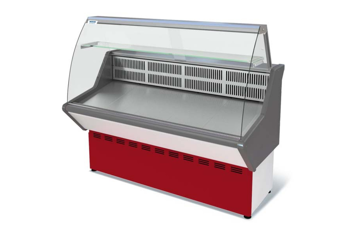 Витрина Нова ВХСн 1,5 универсальная гнутое стекло ля магазинов небольшой площади, павильонов, рынков, уличной торговли, для хранения, демонстрации и продажи мясных и рыбных пресервов, продуктов питания с режимом хранения до -5°С. Достоинства витрины - экономичность, простота и надежность в обслуживании, низкая цена.