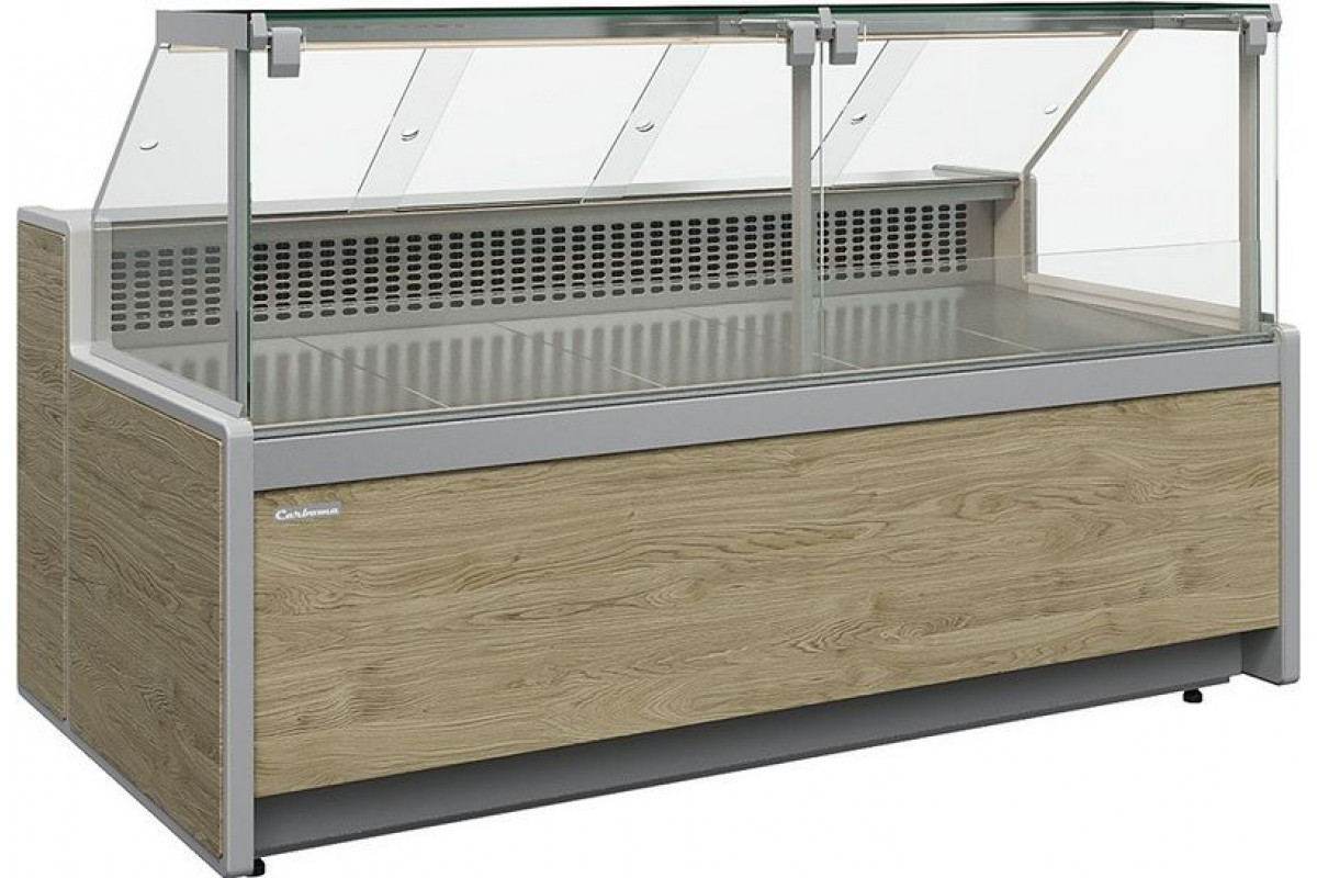 - Экспозиционная поверхность и столешница изготовлены из шлифованной нержавеющей стали, декоративная фронтальная панель – из МДФ;