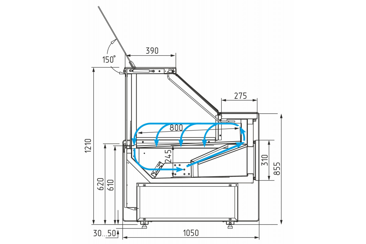 - Экспозиционная поверхность и столешница изготовлены из шлифованной нержавеющей стали, декоративная фронтальная панель – из МДФ;