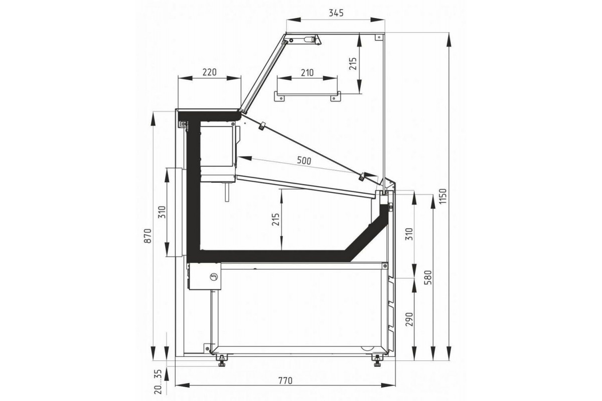 Особенности: Фиксируемое фронтальное стекло, отбойник холода, витрина в стандартной комплектации без боковин, они заказываются отдельно