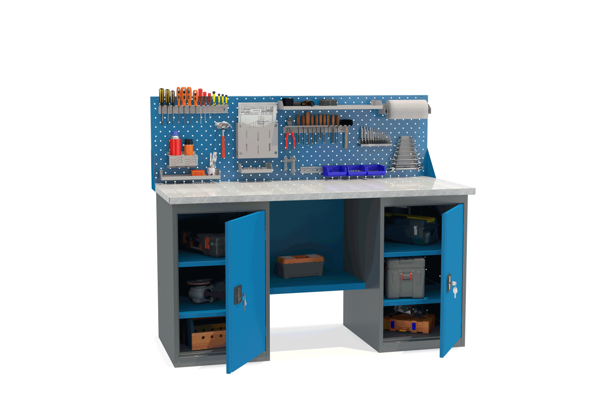 - Верстак укомплектован двумя тумбами с полками.