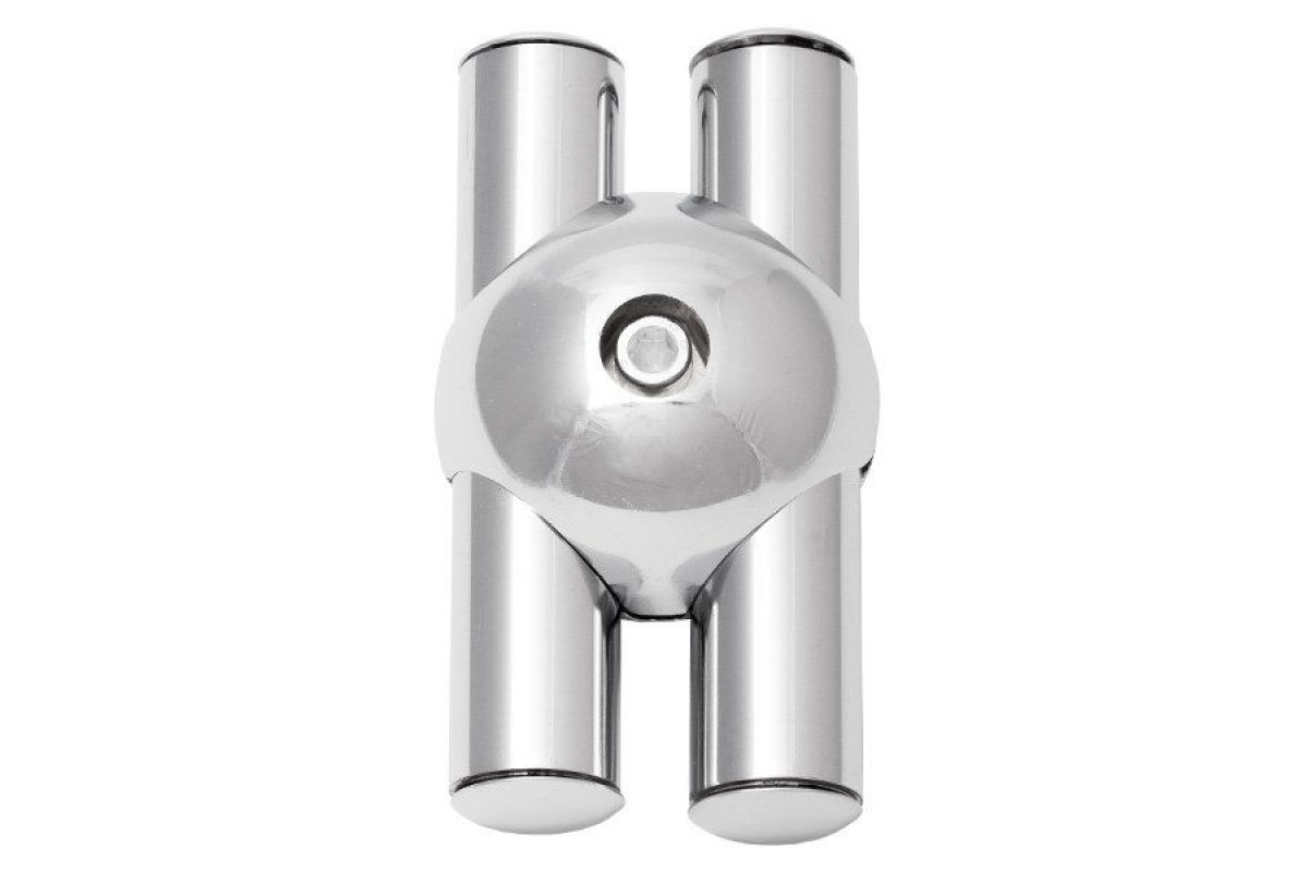 Держатель-краб для двух труб представляет собой устройство, позволяющее соединять трубы диаметром 25 мм, сходящиеся под прямым углом. Применяется при сборке мебели, стеллажей, витрин. Держатель состоит из двух частей, стягиваемых винтом. Материал издел